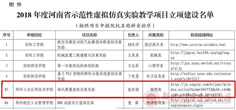 近日,从《河南省教育厅关于2018-2020年开展示范性虚拟仿真实验教学项目建设的通知》(教高〔2018〕267号)和《河南省教育厅办公室关于开展2018年度省级虚拟仿真实验教学项目认定工作的通知》(教办高〔2018〕518号)文件获悉,我校基础教学部张忠锁教授主持的《杨氏模量虚拟仿真实验教学项目》被遴选为2018年省级在线开放虚拟仿真实验教学项目。