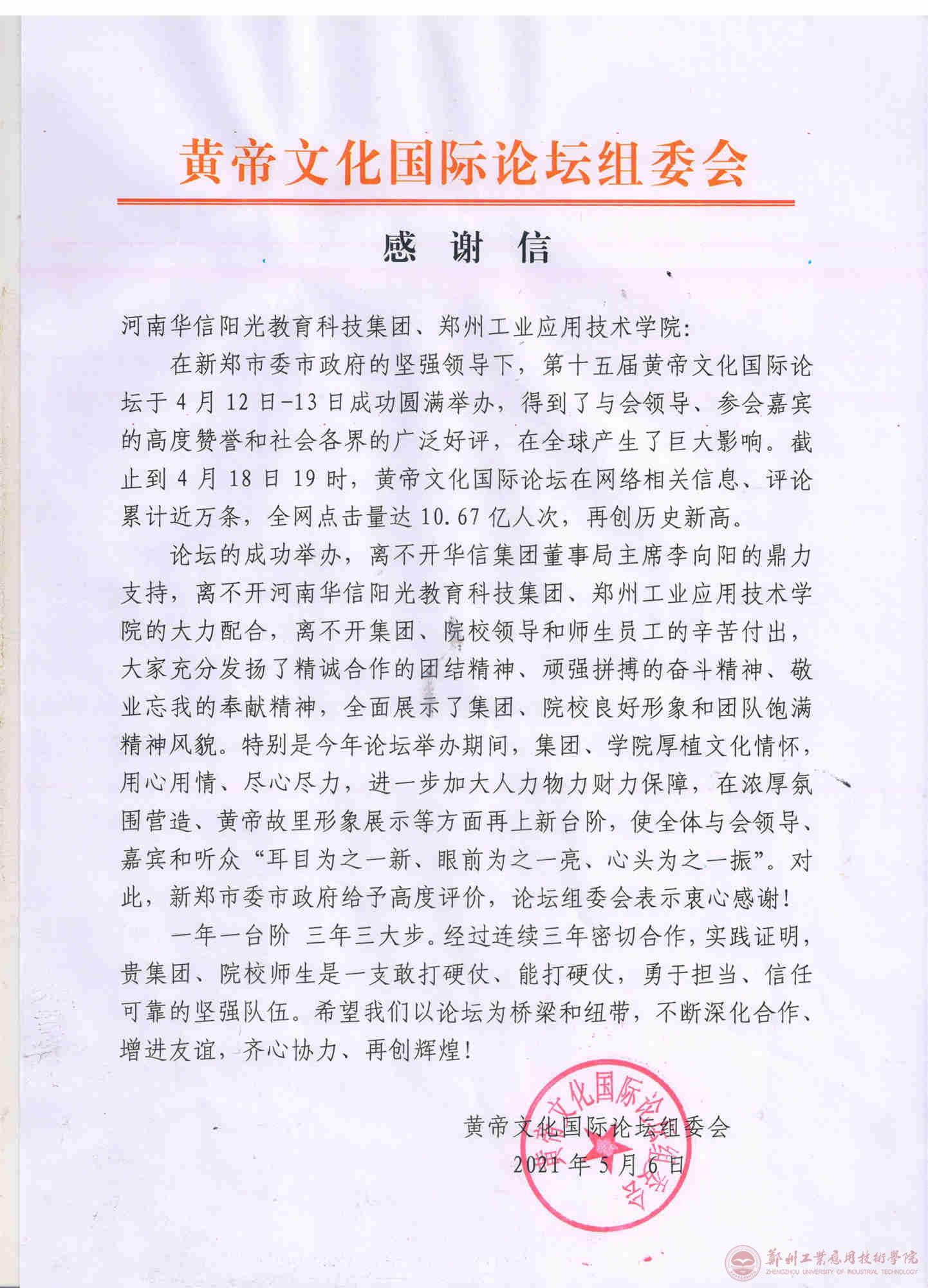 信中写到,论坛的成功举办,离不开学校的大力配合、领导和师生员工的辛苦付出,全面展现了我校的良好形象和团队的饱满精神风貌。同时,也用实践证明了我校师生是一支敢打硬仗、能打硬仗、勇于担当、信任可靠的队伍。感谢信表达了新郑市委市政府、论坛组委会对我校师生的认可和感谢,也让我们眼前再次浮现出我校师生志愿者在论坛举办期间忙碌身影、真诚的笑容。